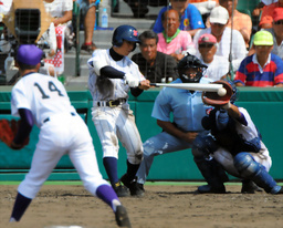 試合が動いたのは3回表。浦添商は8番新田、1番漢那のヒットで1アウト1,3塁とチャンスを作る。ここで打席には2番上地。関東一バッテリーは当然警戒していたが、これを上地がかいくぐってっスクイズを敢行する。これが捕手・中村の落球を誘い、記録は野選。3塁ランナーがホームを駆け抜け、浦添商が先制点を奪う。
