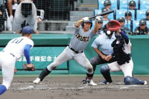 福田は当然、速球主体の攻めを見せ、まずは橋本を球威で詰まらせて2アウト3塁。それでもしっかりとランナーは進めていく。ここで主将・山田が打席へ。カウント2-1と福田が追い込むが、低めのスライダーを山田はうまくとらえ、打球はいい当たりでセンターへ飛ぶ。だが、センター西が振り返り、余裕を持ってキャッチして得点はならず。終盤7回を迎え、いよいよ両者とも役者が出そろっての勝負となってきた。
