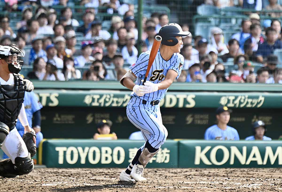 この回、先頭の5番木村がフルカウントから難しいインローのボールを見極めて、四球で出塁。犠打で2塁へ進むと、7番和田、8番日賀、9番藤田となんと3者連続のタイムリー2塁打を放つ。かさにかかった時の相模の攻撃はすさまじいものがある。カウントを取りに来たボールを逃さない集中力、打席に入る前からのタイミングを含めた準備の仕方。伝統のアグレッシブベースボールは、「細部」に宿っていると言えるだろう。仕掛けの早さこそ彼らの強みだ。2024年度の高校球界のエースを完膚なきまでに打ち込んで見せた。