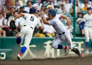 甲子園の女神はこういう雰囲気に敏感だ。直後の5回表、先発していた6番池田が四球を選ぶと、犠打で2塁へ。ここで木代監督は迷いなく、右腕・市場をマウンドに上げる。木代監督の迷いのない継投。しかし、2アウト後に打撃のいい9番織田が、インサイドの速球を力でセンターへ運び、2塁ランナーが生還して同点に追いつく。横浜にとっては枷の取れた同点劇だっただろう。すかさず盗塁も仕掛け、堅さの取れたプレーが見え始める。すると、ここで木代監督は投手を初戦で登板した左腕・藤田にスイッチ。互いに激しく主導権を奪い合う。